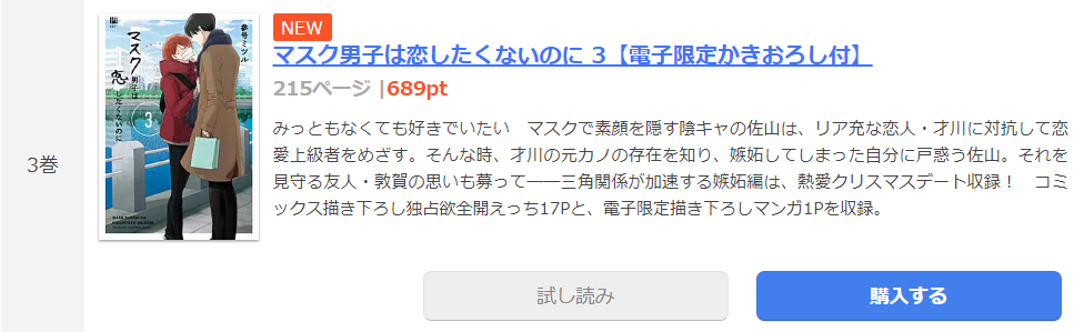 「マスク男子は恋したくないのに」1冊689円なのが、もらえるポイントで1冊が500円引きに。